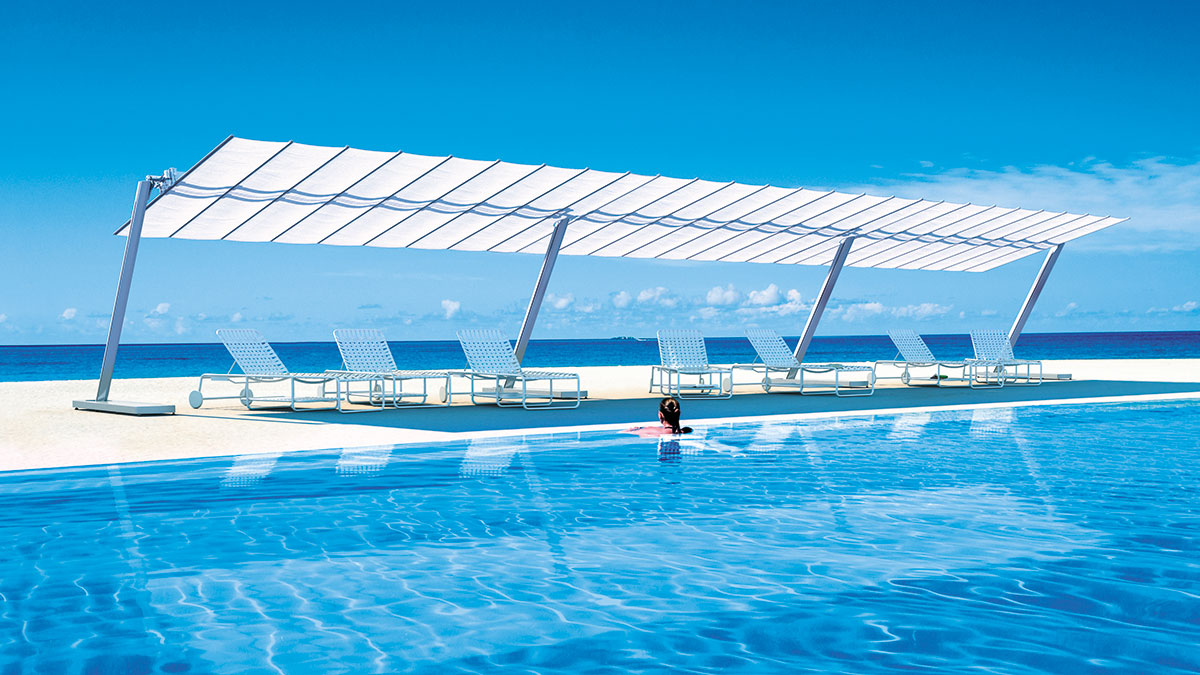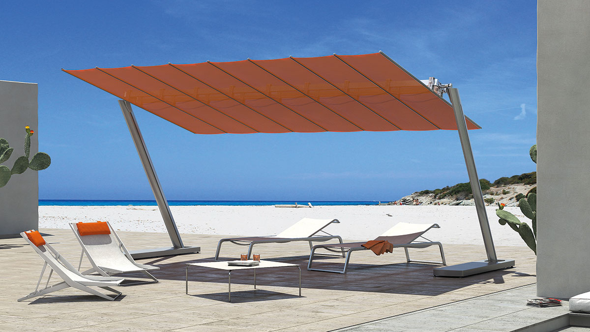 Das modulare System mit modernem und linearem Design, das die Beschattung großer Flächen ohne Belegung des Zentralbereichs ermöglicht. In 10 Größen verfügbar, die ggf. miteinander kombiniert werden können. Das System gestattet die Kombination mehrerer Module und ermöglicht die Beschattung großer Flächen. Der Sonnenfächer lässt sich dank seines sowohl manuellen als auch elektrischen Systems leicht schließen und kann geneigt werden, um im Tagesverlauf stets das Maximum an Schatten zu spenden.