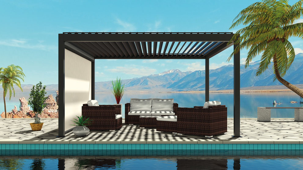 Mit dem Pergolasystem clima Q.bus erhalten Sie eine flexible Überdachung für effektiven Hitze- und Blendschutz. Durch die wendbaren Aluminiumlamellen können Sie die Sonne durchlassen und erhalten im geschlossenen Zustand bei Regen einen erstaunlich guten Schutz. Durch das Regenrinnensystem kann das Wasser unsichtbar in den vorderen Stützen ablaufen.