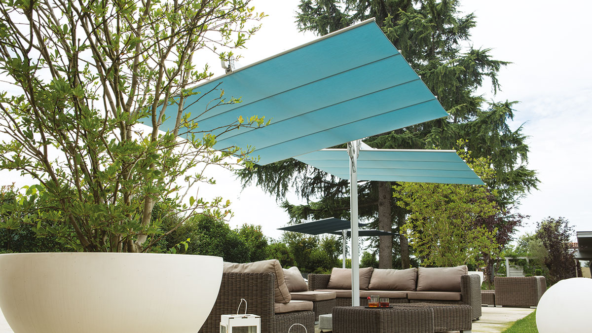 Das modulare System mit modernem und linearem Design, das die Beschattung großer Flächen ohne Belegung des Zentralbereichs ermöglicht. In 10 Größen verfügbar, die ggf. miteinander kombiniert werden können. Das System gestattet die Kombination mehrerer Module und ermöglicht die Beschattung großer Flächen. Der Sonnenfächer lässt sich dank seines sowohl manuellen als auch elektrischen Systems leicht schließen und kann geneigt werden, um im Tagesverlauf stets das Maximum an Schatten zu spenden.
